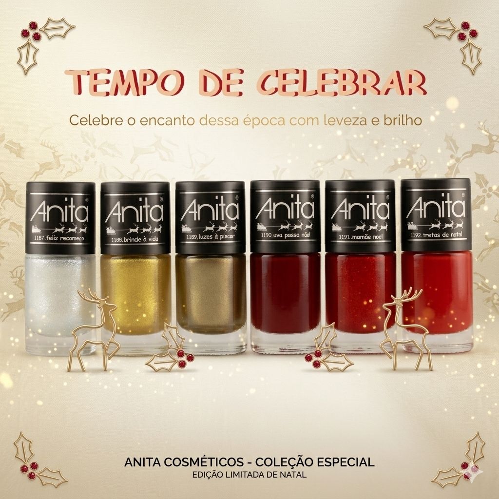 A Coleção Tempo de Celebrar da Anita foi desenvolvida para transformar cada momento em uma ocasião especial. Com cores modernas e acabamento impecável, os esmaltes oferecem alta cobertura, secagem rápida e brilho intenso.